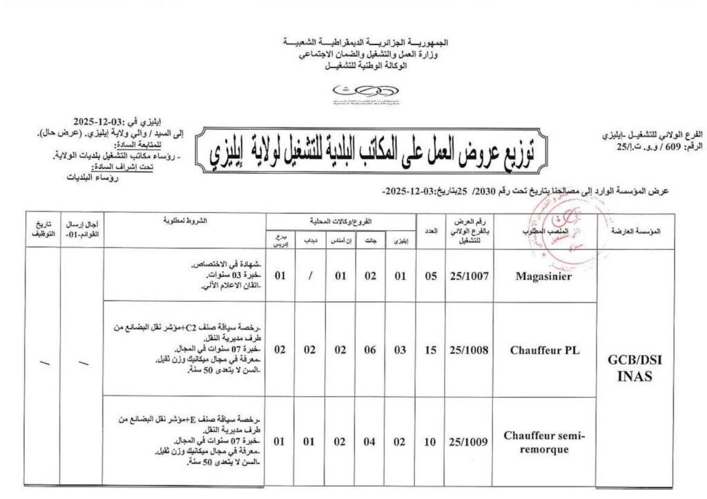 توزيع عروض العمل على المكاتب البلدية للتشغيل لولاية إيليزي