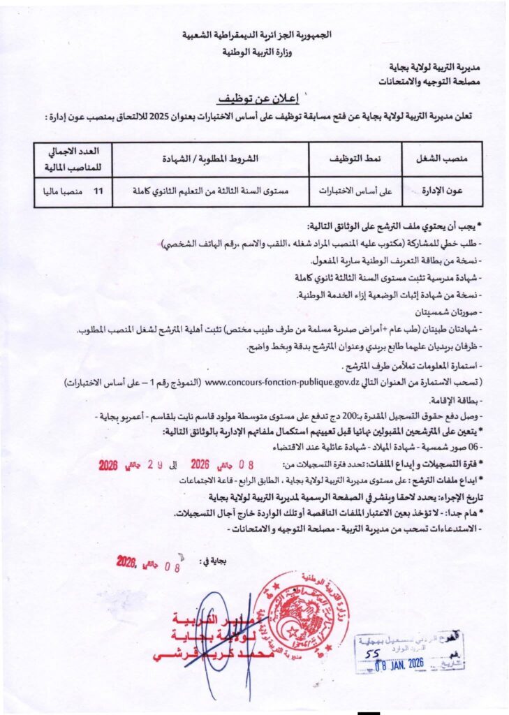 تعلن مديرية التربية لولاية بجاية عن فتح مسابقة توظيف على أساس الاختبارات بعنوان سنة 2025 للالتحاق بمنصب الشغل المبين أدناه: