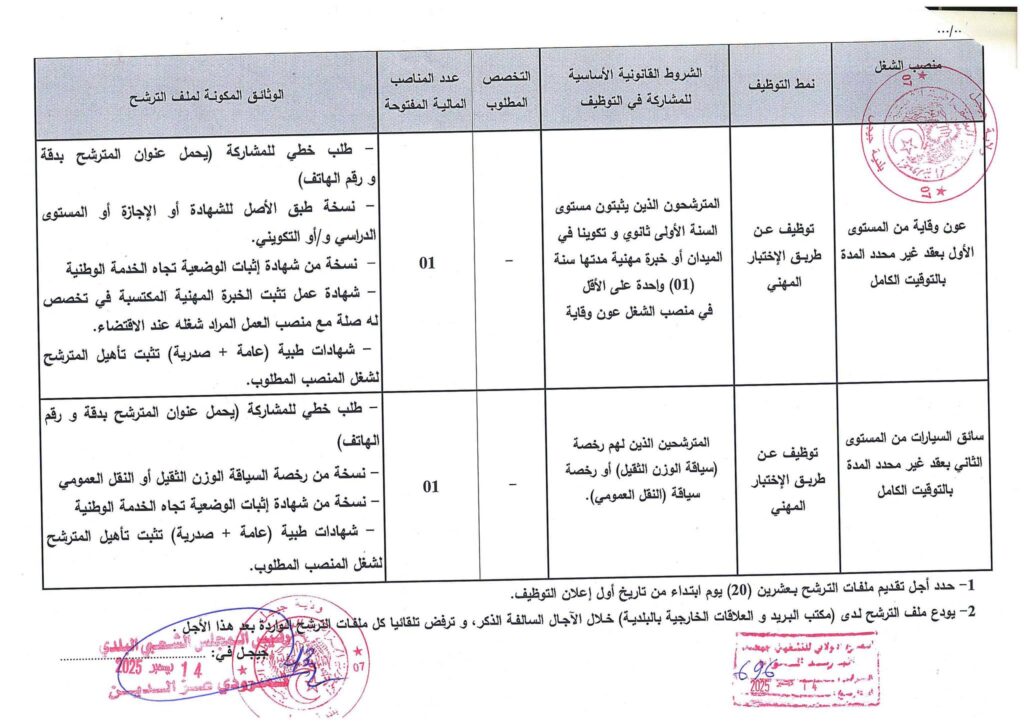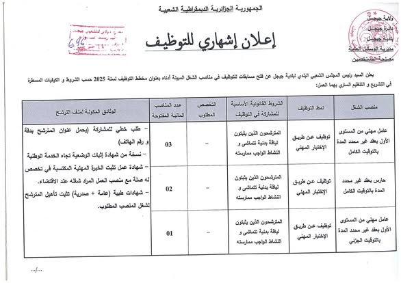 يعلن السيد رئيس المجلس الشعبي البلدي لبلدية جيجل عن فتح مسابقات للتواليف في مناصب الشغل المبينة أبناء بعنوان مخطط التوظيف لسنة 2025 حسب الشروط والكيفيات المسطرة