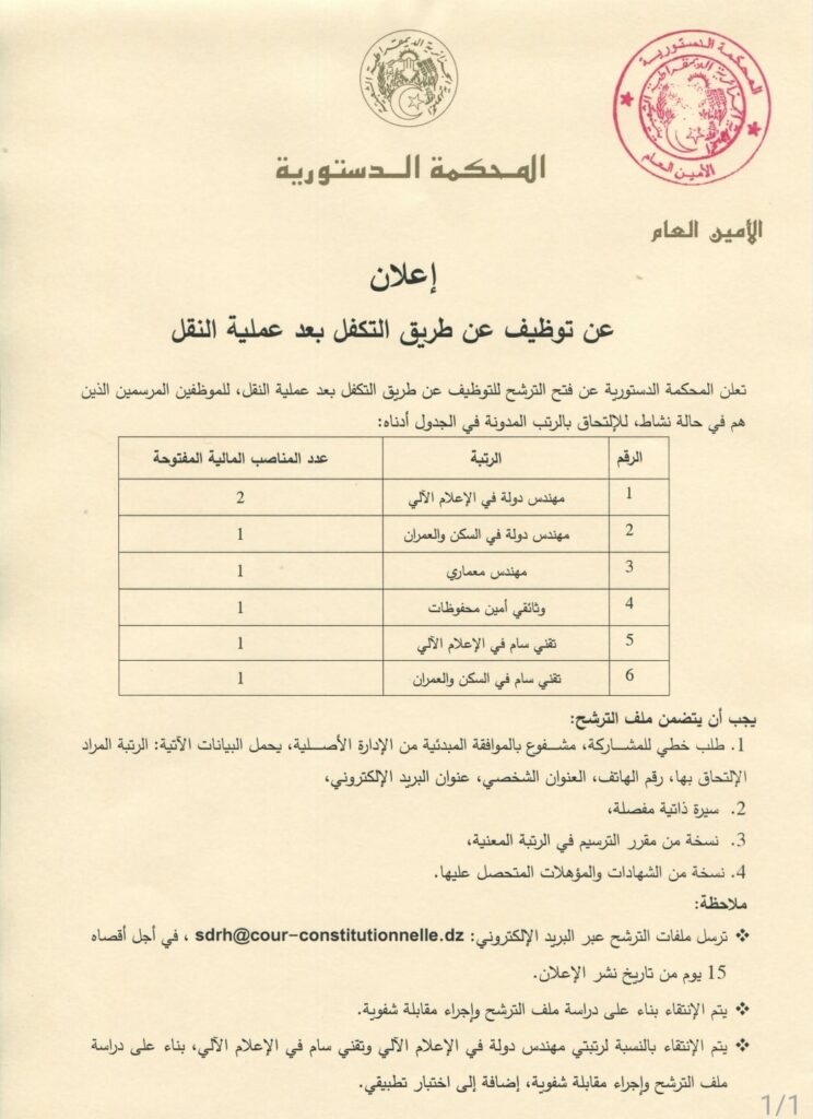 تعلن المحكمة الدستورية عن فتح باب الترشح للتوظيف عن طريق التكفل بعد عملية النقل، لفائدة الموظفين المرسمين الذين هم في حالة نشاط، للالتحاق بالرتب المبينة في الجدول أدناه: