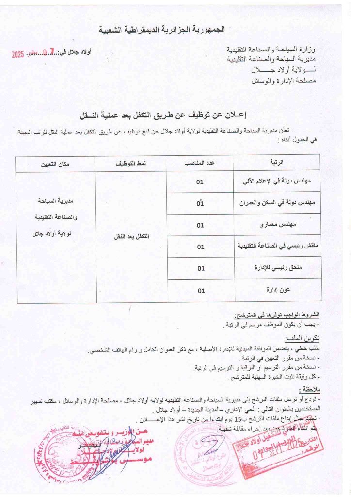 تعلن مديرية السياحة والصناعة التقليدية لولاية أولاد جلال عن فتح توظيف عن طريق التكفل بعد عملية النقل في الرتب المبينة أدناه: