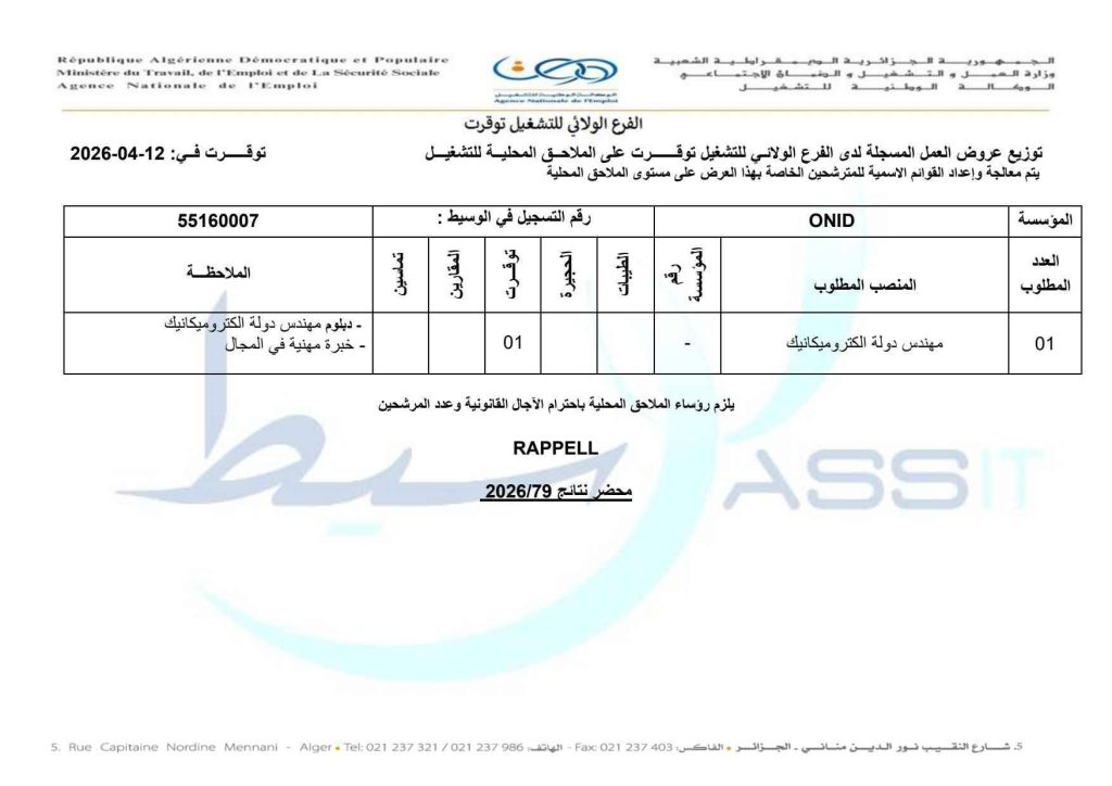 | ONID | مهندس دولة الكتروميكانيك | -01 | –55160007 |