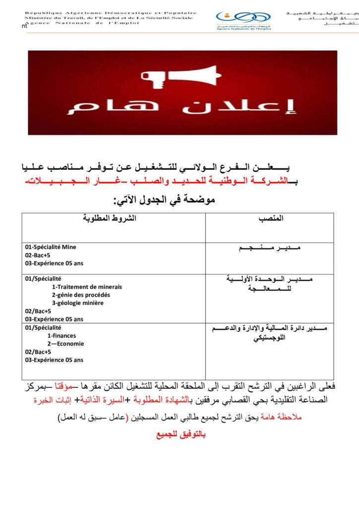 يعلن الفرع الولائي للتشغيل عن توفر مناصب عليا لدى الشركة الوطنية للحديد والصلب – غار جبيلات، وذلك وفق التفاصيل الموضحة في الجدول التالي: