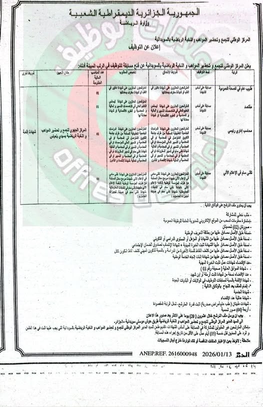 اعلان توظيف في المركز الوطني لتجمع وتحضير المواهب والنخبة الرياضية بالسويدانية