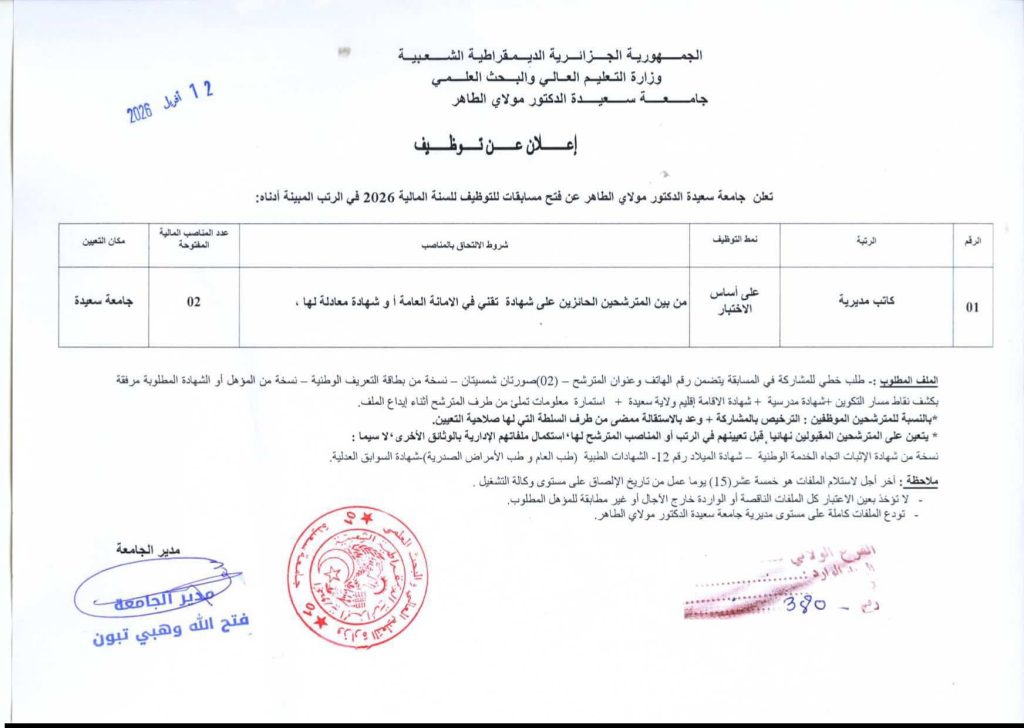 اعلان توظيف في جامعة سعيدة الدكتور مولاي الطاهر