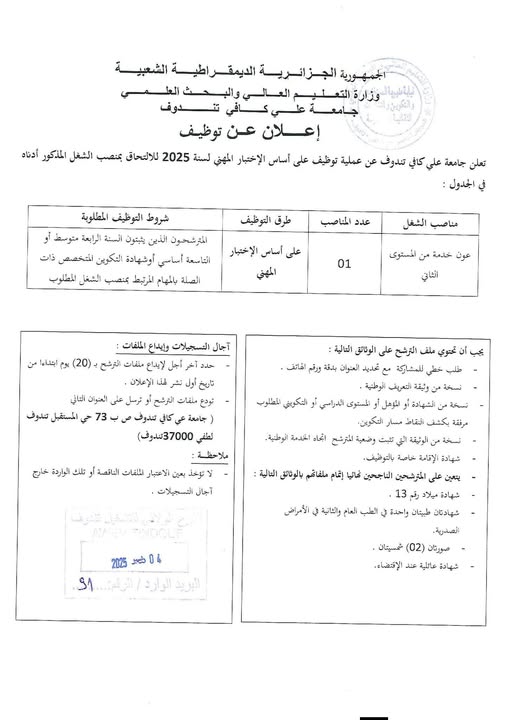 تعلن جامعة علي كافي تندوف عن فتح مسابقة توظيف على أساس الاختبار المهني لسنة 2025 للالتحاق بمنصب الشغل المبين أدناه: