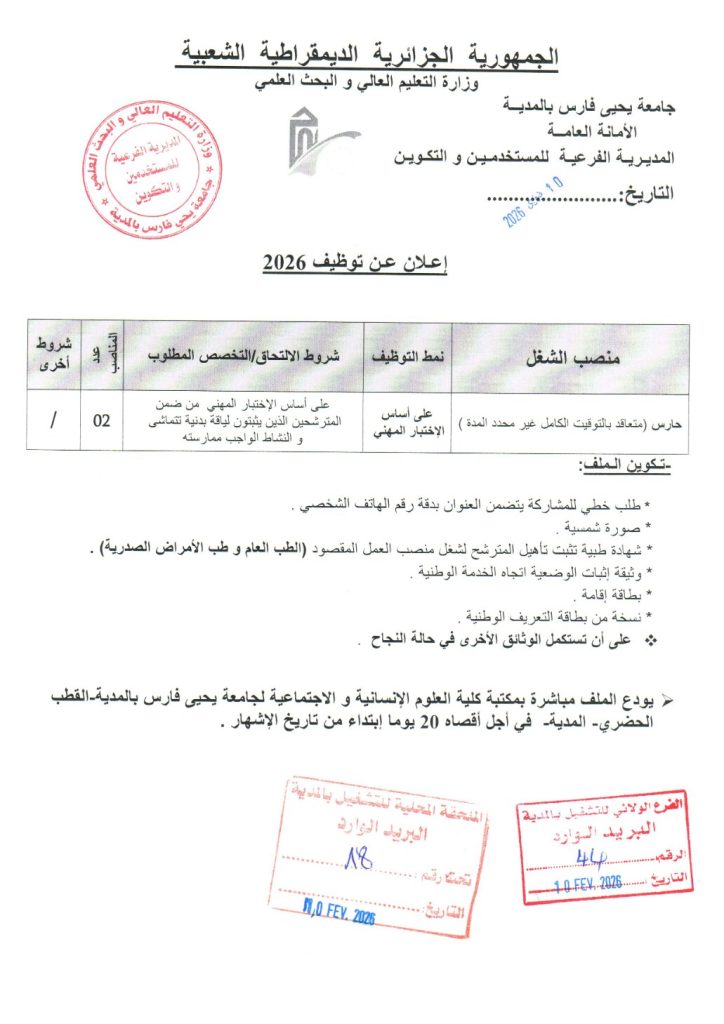 اعلان توظيف في جامعة يحيى فارس بالمدية