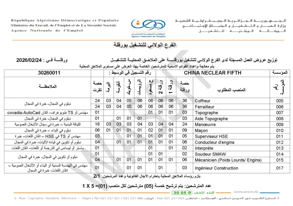 اعلان توظيف في شركة الصينية CHINA NUCLEAR FIFTH بالجزائر