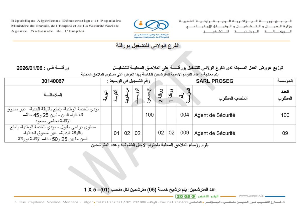 009 Agent de Sécurité 9 مستوى دراسي مقبول – مؤدي الخدمة الوطنية – يتمتع باللياقة البدنية – غير مسبوق قضائياً – السن بين 25 و50 سنة – الإقامة بورقلة