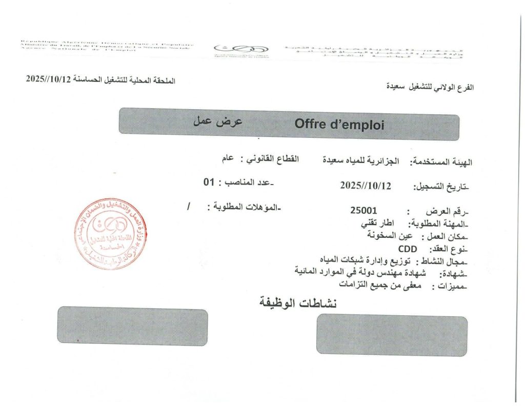 الهيئة المستخدمة: الجزائرية للمياه سعيدة