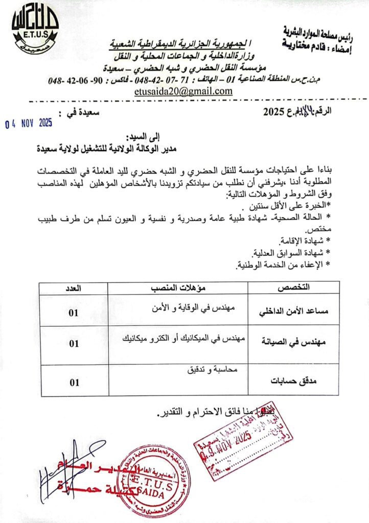استنادًا إلى احتياجات مؤسسة النقل الحضري وشبه الحضري لسعيدة لليد العاملة في التخصصات المطلوبة، يشرفنا طلب تزويدنا بالأشخاص المؤهلين لهذه المناصب وفق الشروط والمؤهلات التالية: