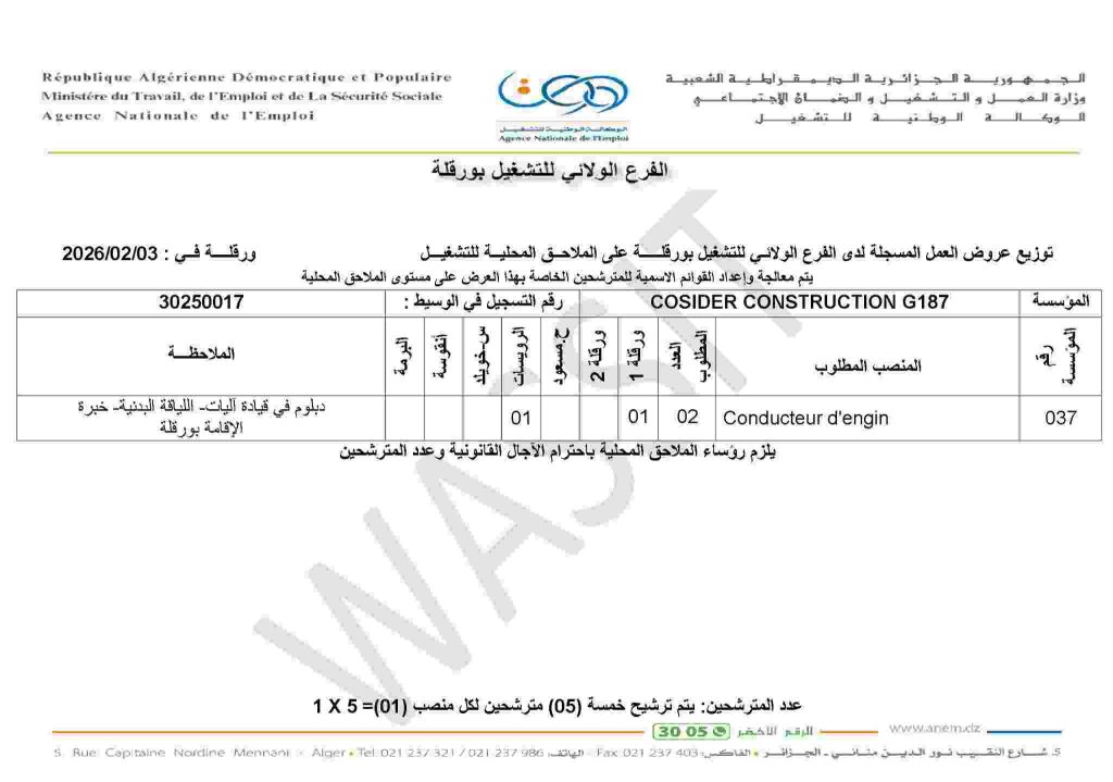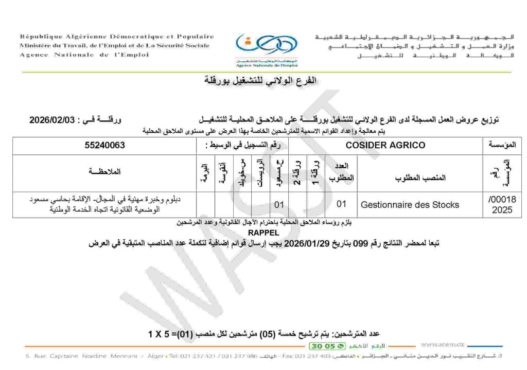 جهة الإصدار: الجمهورية الجزائرية الديمقراطية الشعبية – وزارة العمل والتشغيل والضمان الاجتماعي – الوكالة الوطنية للتشغيل – الفرع الولائي للتشغيل بورقلة.