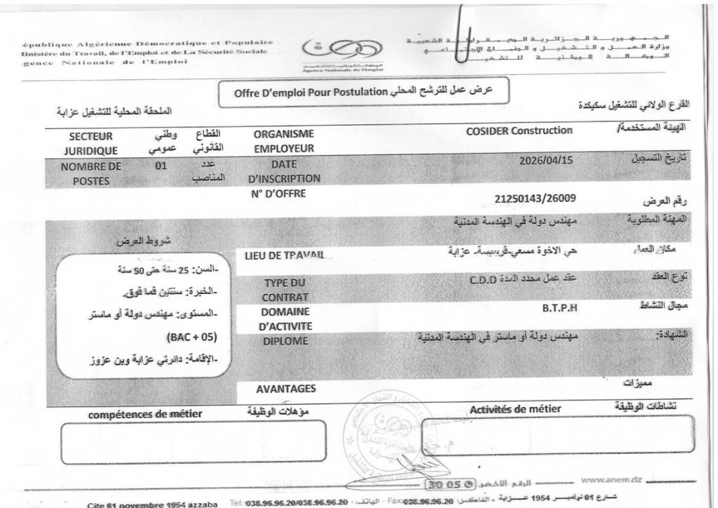 | مهندس دولة في الهندسة المدنية | 01 | 2026/04/15 | مهندس دولة أو ماستر في الهندسة المدنية (BAC + 05) | السن: 25 سنة حتى 50 سنة، الخبرة: سنتين فما فوق، المستوى: مهندس دولة أو ماستر (BAC + 05)، الإقامة: دائرتي عزابة وبن عزوز |