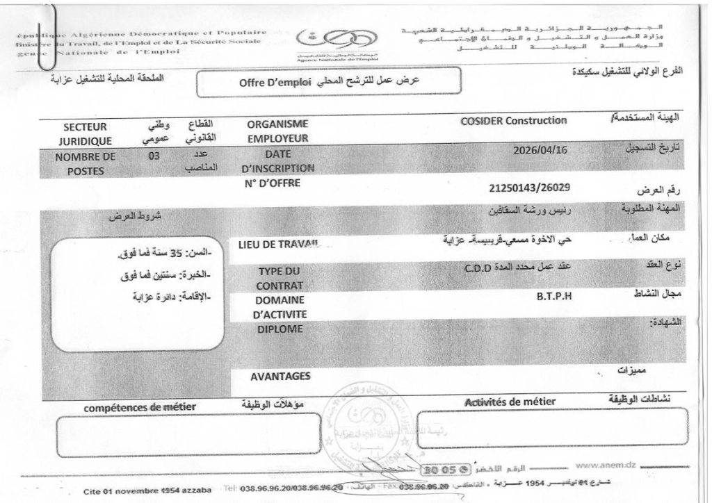 | رئيس ورشة السقائين | 03 | 2026/04/16 | – | السن: 35 سنة فما فوق، الخبرة: سنتين فما فوق، الإقامة: دائرة عزابة |