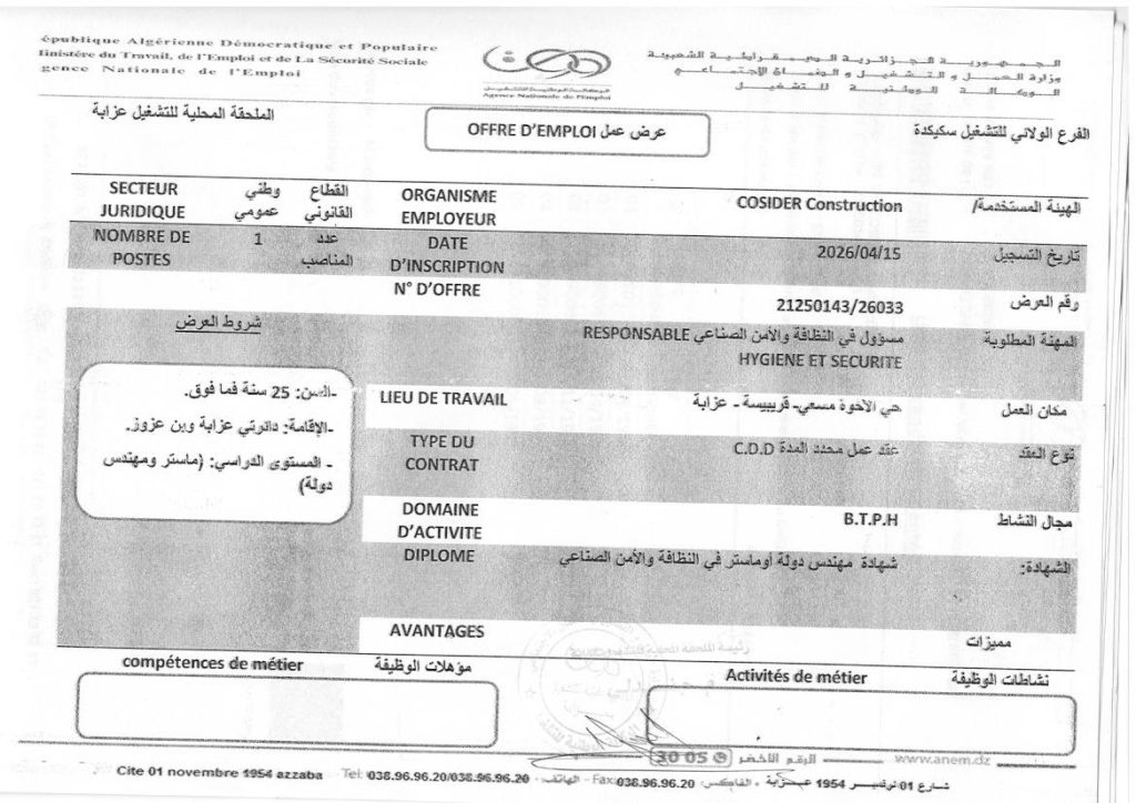 | مسؤول في النظافة والأمن الصناعي (RESPONSABLE HYGIENE ET SECURITE) | 01 | 2026/04/15 | شهادة مهندس دولة أو ماستر في النظافة والأمن الصناعي | السن: 25 سنة فما فوق، الإقامة: دائرتي عزابة وبن عزوز، المستوى الدراسي: مهندس دولة و ماستر |