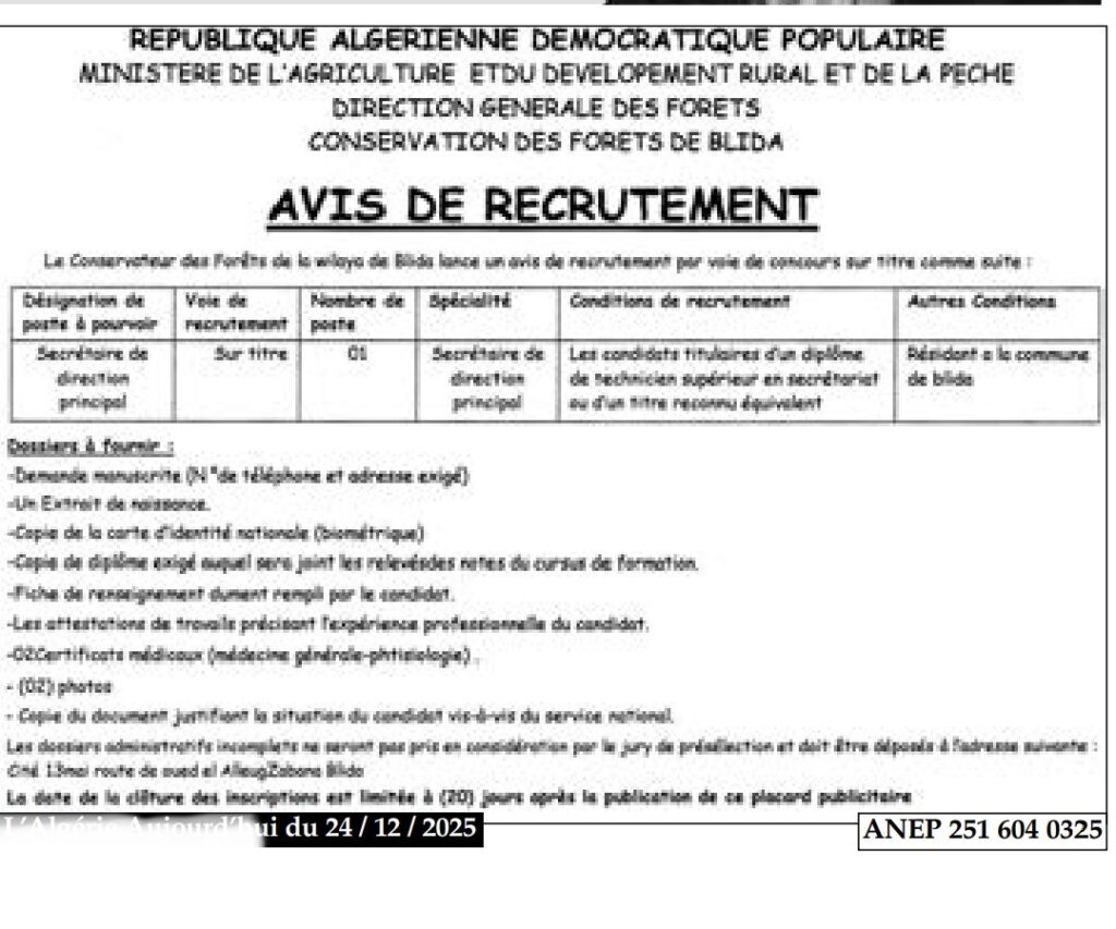 تعلن محافظة الغابات لولاية البليدة عن فتح مسابقة توظيف على أساس الشهادة، وذلك وفق الشروط المبينة أدناه: