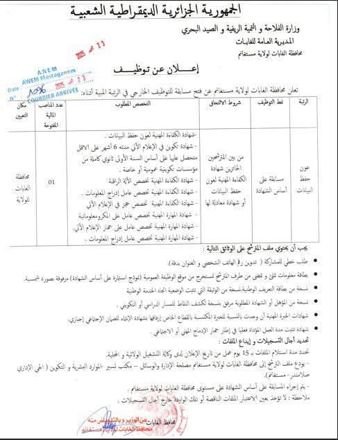 | عون حفظ بيانات | على أساس الشهادة | — | من بين المترشحين الحاصلين على شهادة الكفاءة المهنية لعون حفظ البيانات أو شهادة المهارة المهنية تخصص عامل إدراج المعلومات أو شهادة تكوين في الإعلام الآلي مدتها 6 أشهر على الأقل متحصل عليها بعد السنة الأولى من التعليم الثانوي | الإعلام الآلي / إدراج المعلومات / حفظ البيانات | محافظة الغابات لولاية مستغانم |