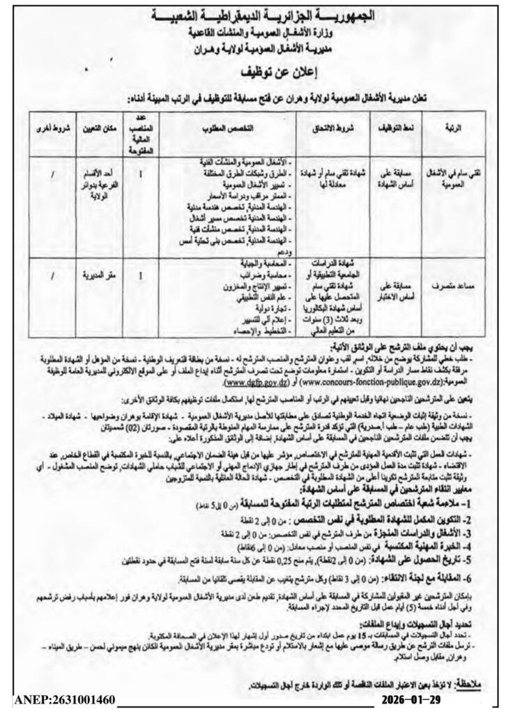 اعلان توظيف في مديرية الأشغال العمومية لولاية وهران