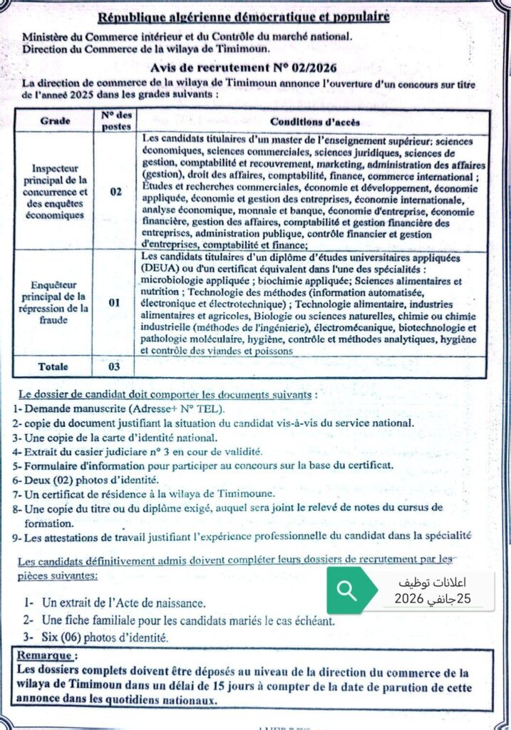 تعلن مديرية التجارة لولاية تيميمون عن فتح مسابقة توظيف على أساس الشهادة بعنوان سنة 2025، للالتحاق بالرتب التالية:
