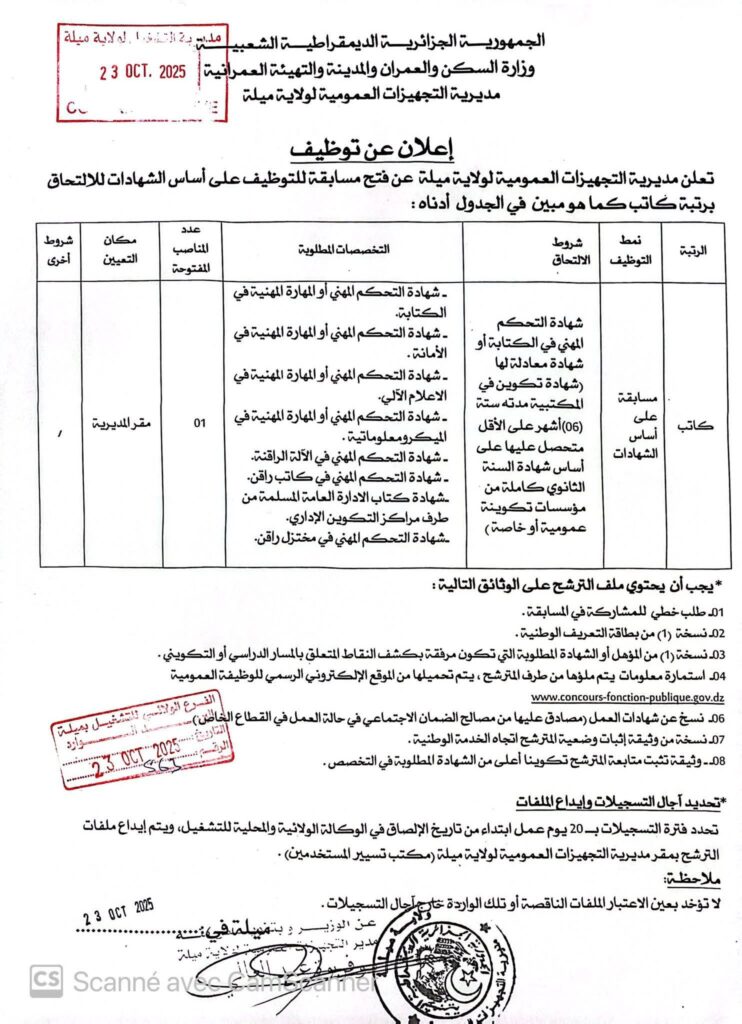 تعلن مديرية التجهيزات العمومية لولاية ميلة عن فتح مسابقة للتوظيف على أساس الشهادات ومسابقة على أساس الاختبار المهني للالتحاق بالرتب التالية: