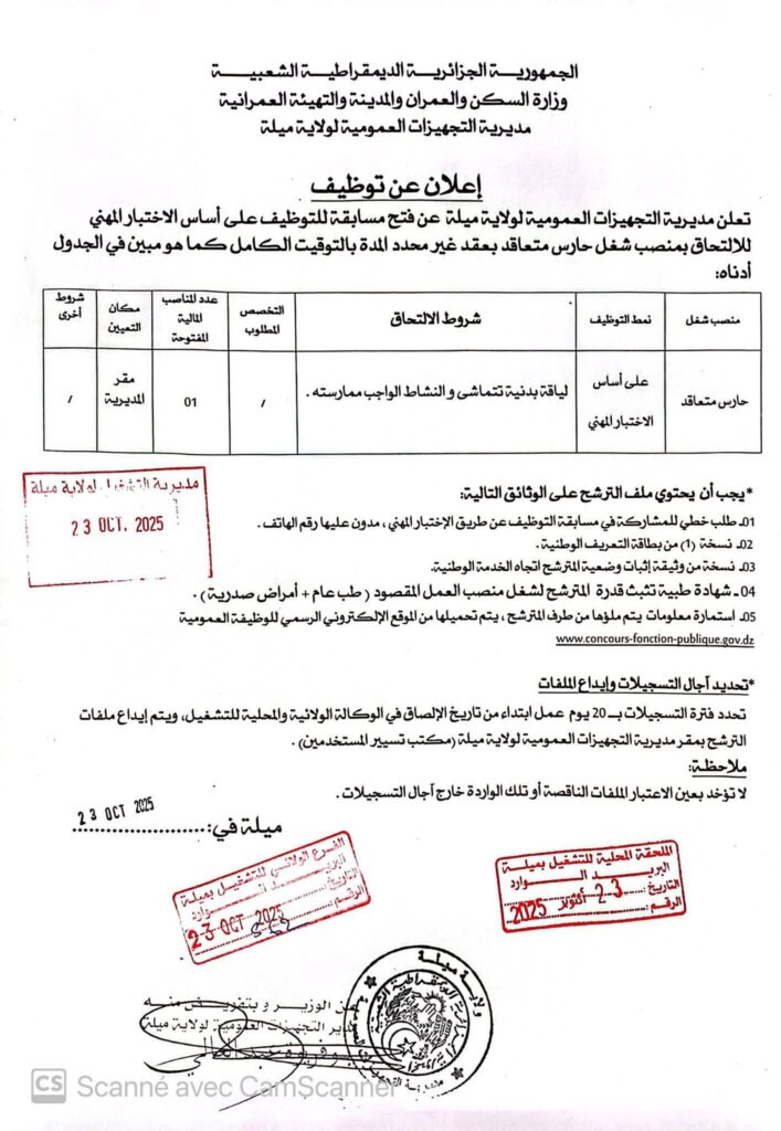 | حارس متعاقد بعقد غير محدد المدة بالتوقيت الكامل | على أساس الاختبار المهني | لياقة بدنية تتماشى مع طبيعة النشاط الواجب ممارسته | 01 | مقر مديرية التجهيزات العمومية لولاية ميلة |