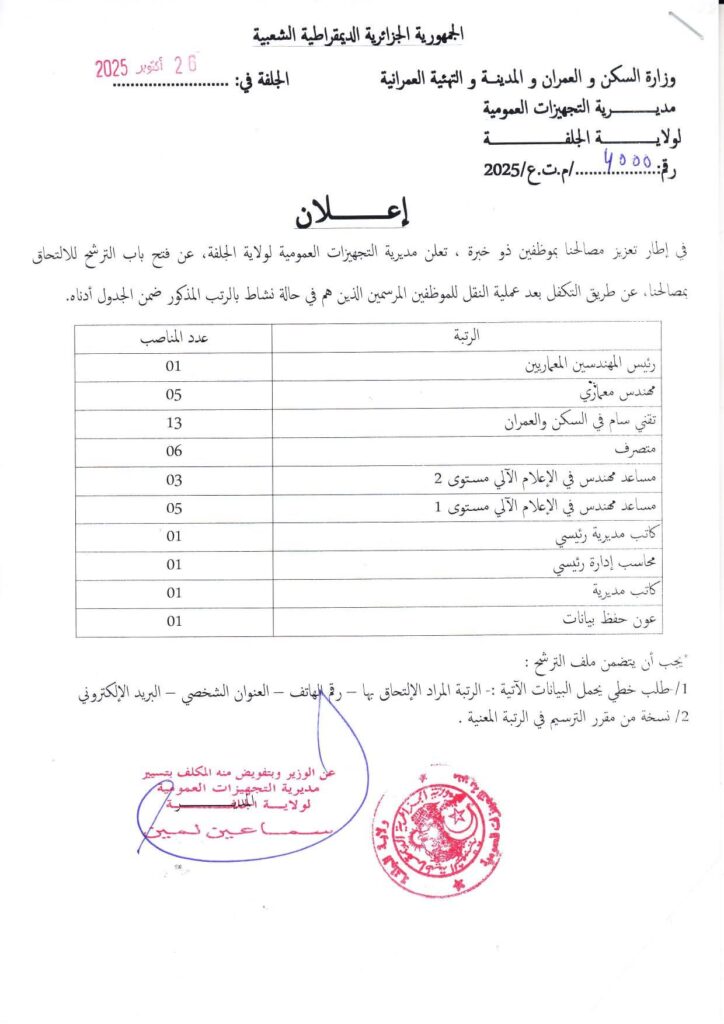 في إطار تعزيز مصالح مديرية التجهيزات العمومية لولاية الجلفة بموظفين ذوي خبرة، تعلن المديرية عن فتح باب الترشح عن طريق التكفل بعد عملية النقل لفائدة الموظفين المرسمين الذين هم في حالة نشاط، وذلك للالتحاق بالرتب المبينة في الجدول أدناه: