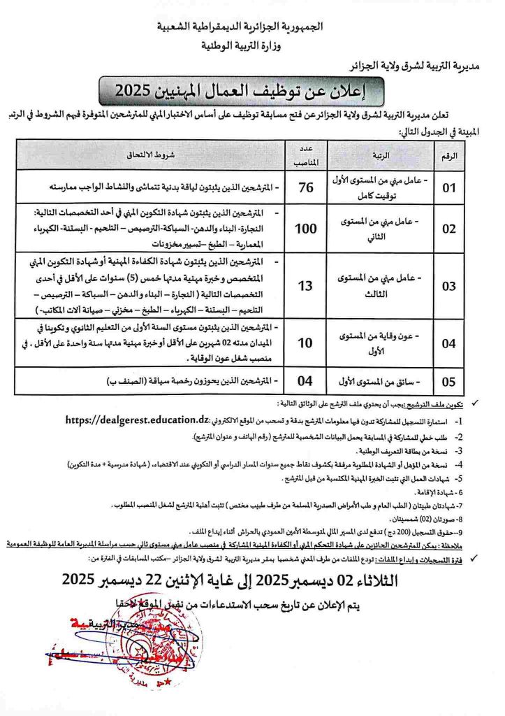تعلن مديرية التربية لشرق ولاية الجزائر عن فتح مسابقة توظيف على أساس الاختبار المهني للمترشحين المتوفرين فيهم الشروط في الرتب المبينة في الجدول التالي: