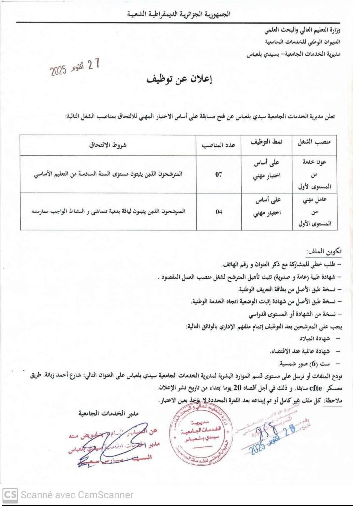 اعلان توظيف في مديرية الخدمات الجامعية سيدي بلعباس