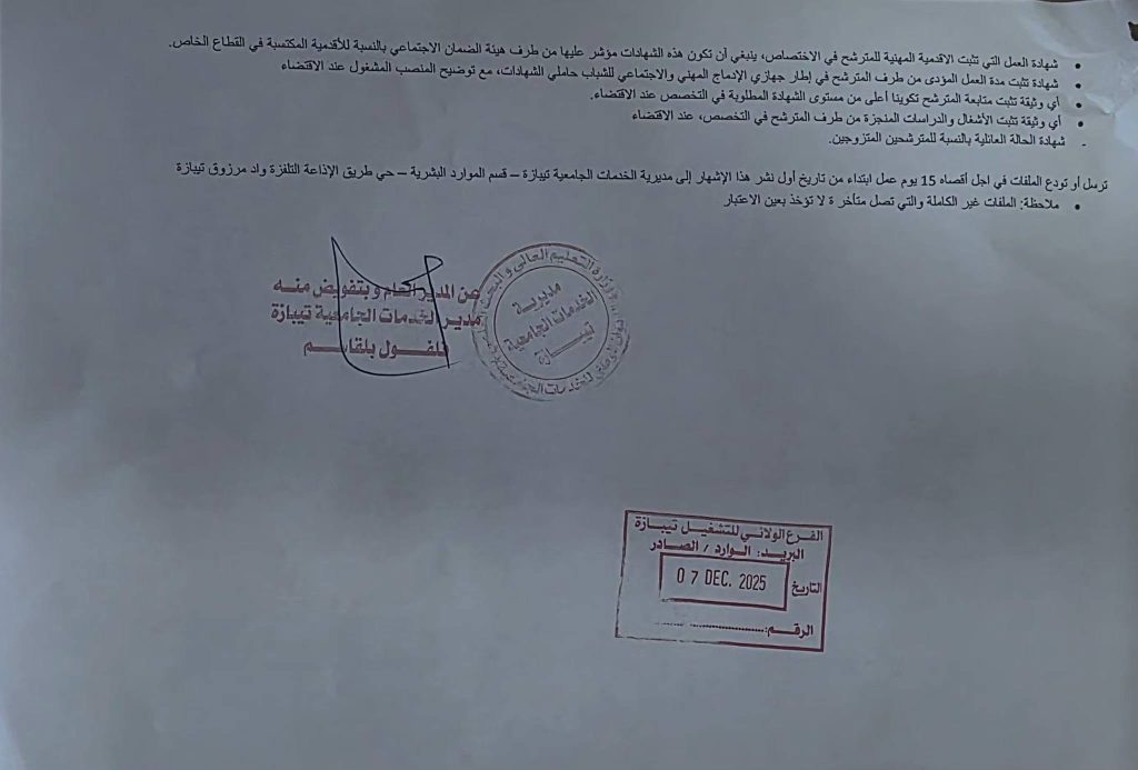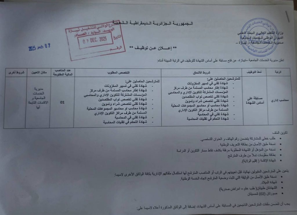 اعلان توظيف في مديرية الخدمات الجامعية تيبازة