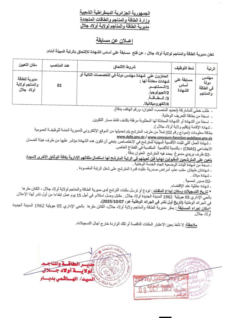 اعلان توظيف في مديرية الطاقة والمناجم لولاية أولاد جلال