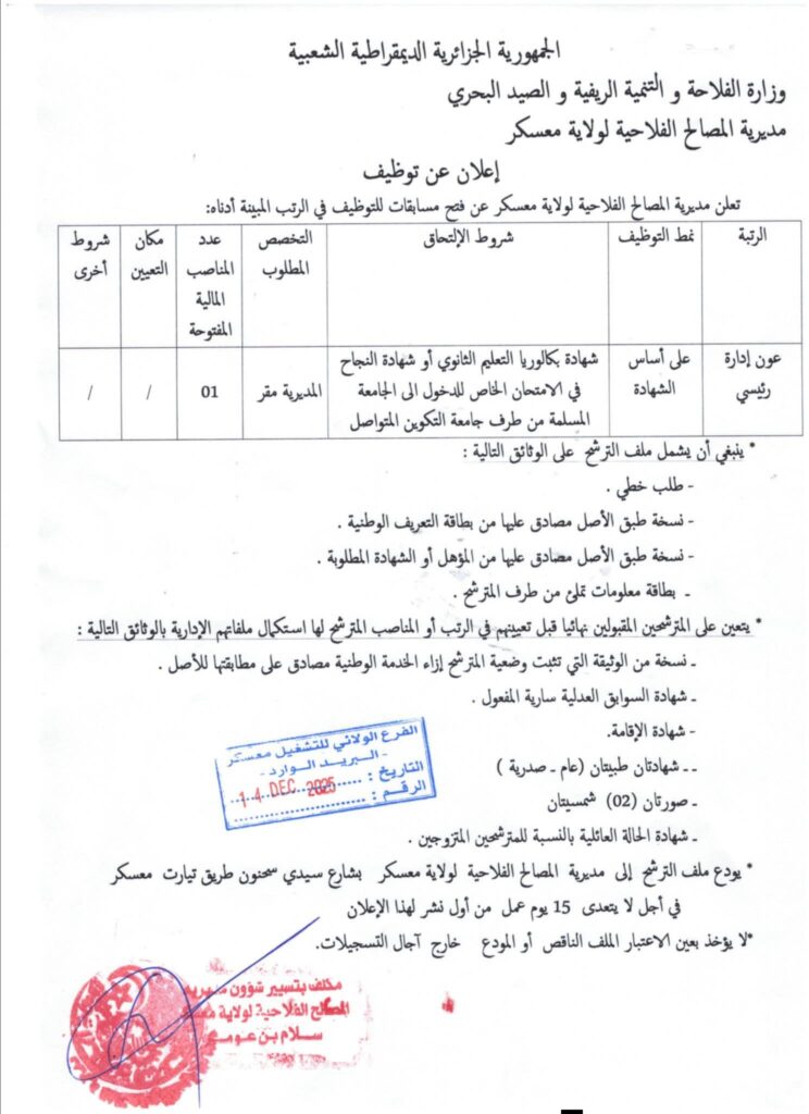 اعلان توظيف في مديرية المصالح الفلاحية لولاية معسكر