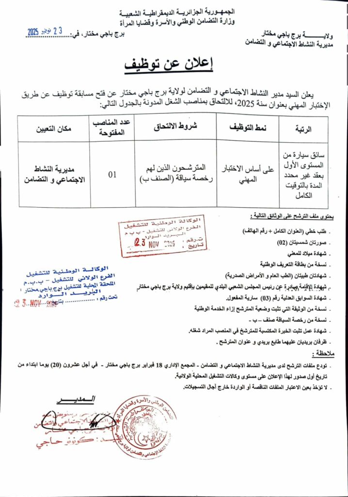 اعلان توظيف في مديرية النشاط الاجتماعي والتضامن لولاية برج باجي مختار