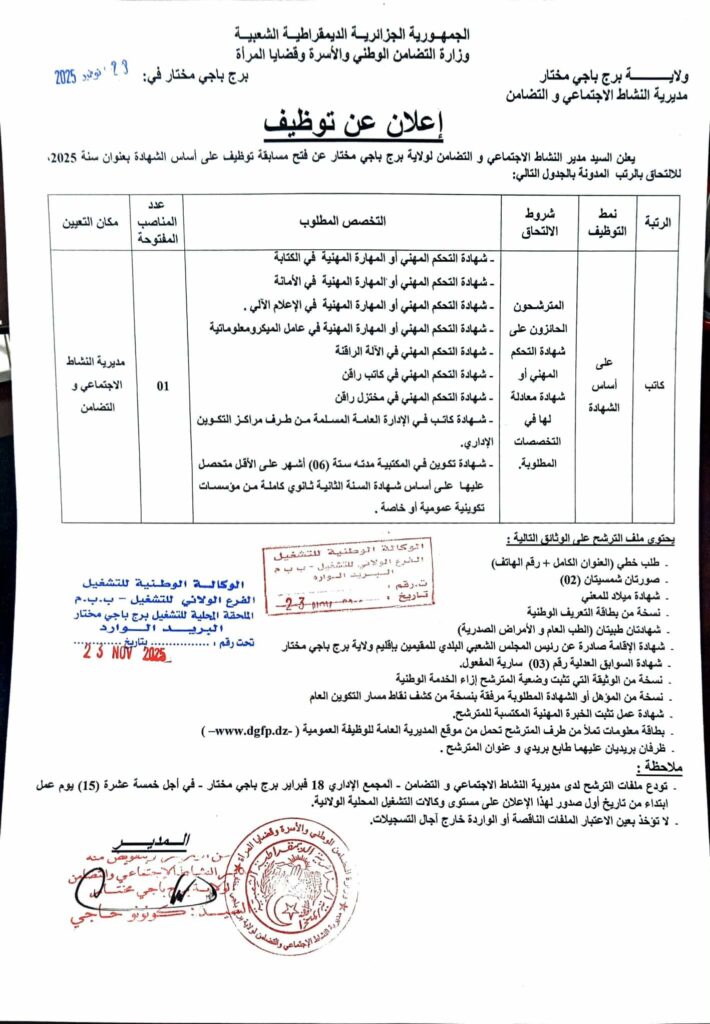يعلن مدير النشاط الاجتماعي والتضامن لولاية برج باجي مختار عن فتح مسابقة توظيف على أساس الشهادة بعنوان 2025 للالتحاق بالرتبة التالية: