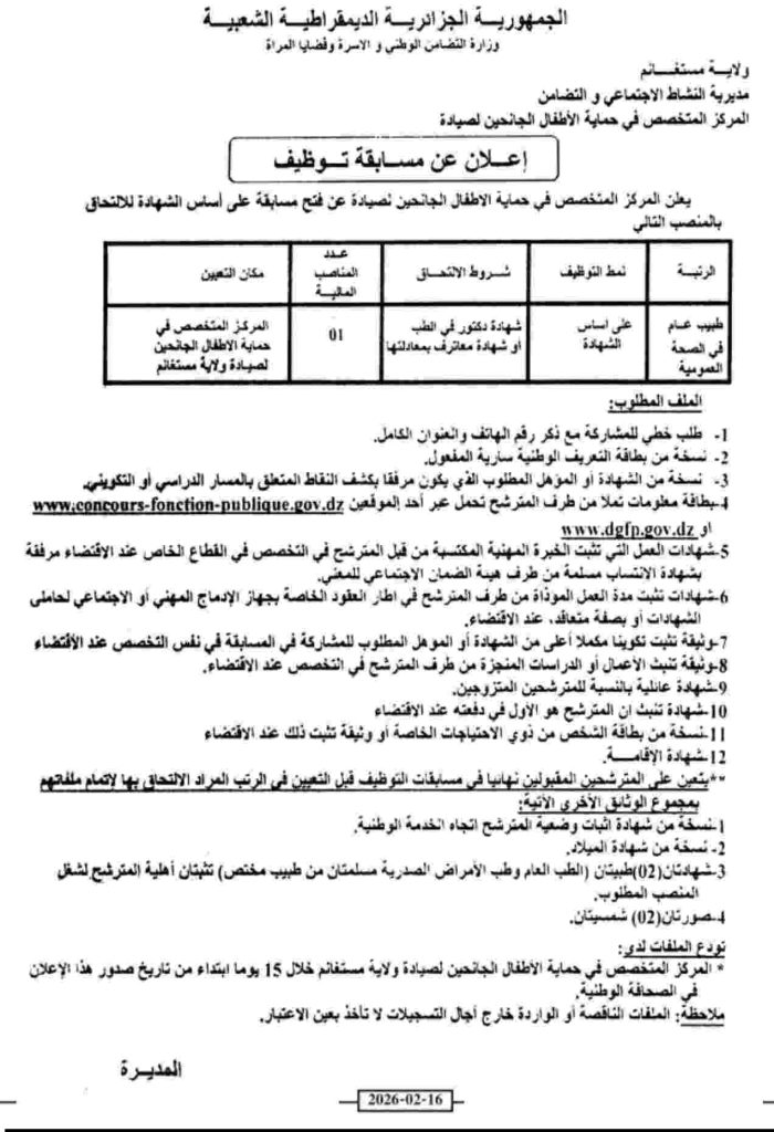 | طبيب عام في الصحة العمومية | على أساس الشهادة | شهادة دكتور في الطب أو شهادة معترف بمعادلتها | 01 | المركز المتخصص في حماية الأطفال الجانحين لصيادة ولاية مستغانم |