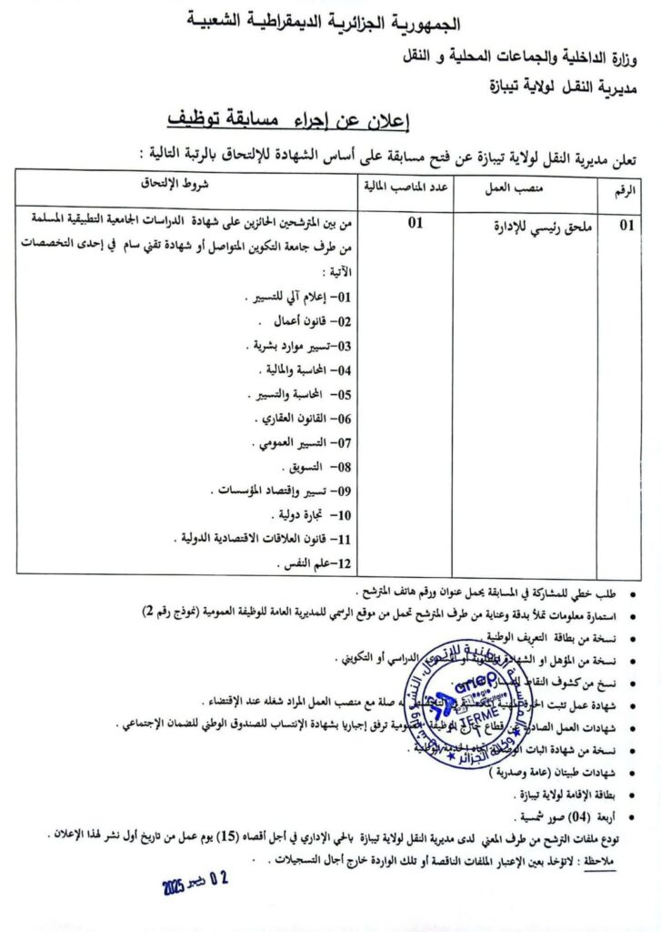 تعلن مديرية النقل لولاية تيبازة عن فتح مسابقة على أساس الشهادة للالتحاق بالرتبة التالية: