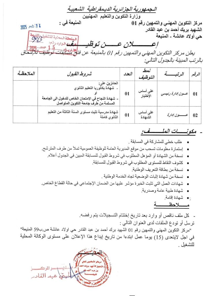 اعلان توظيف في مركز التكوين المهني والتمهين رقم (01) بالمنيعة