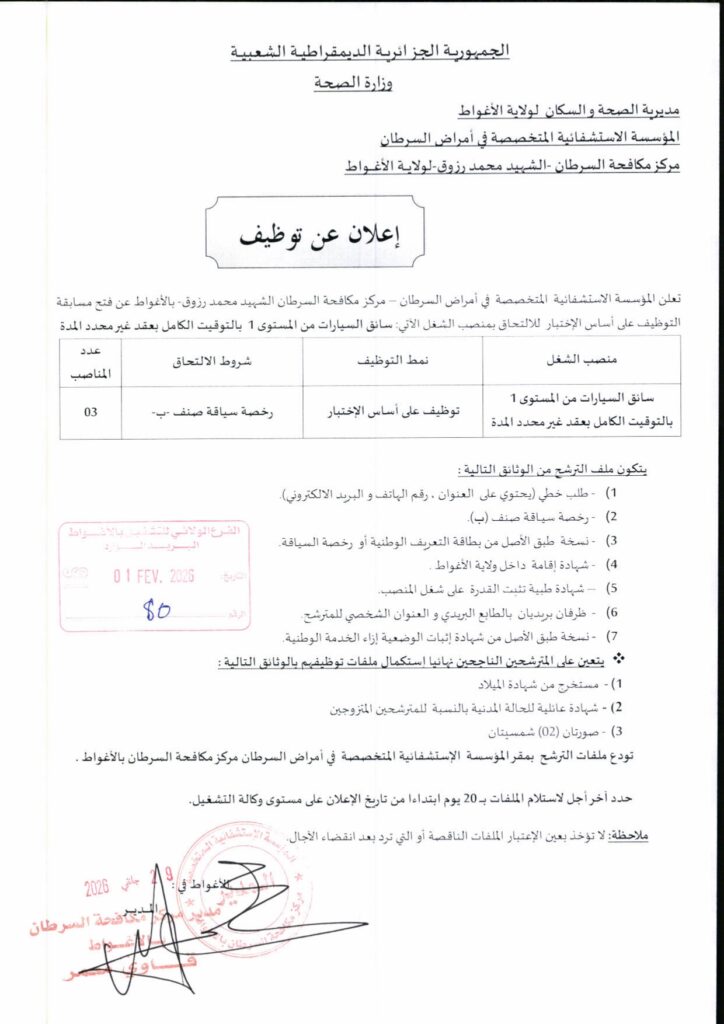 اعلان توظيف في مركز مكافحة السرطان بولاية الأغواط