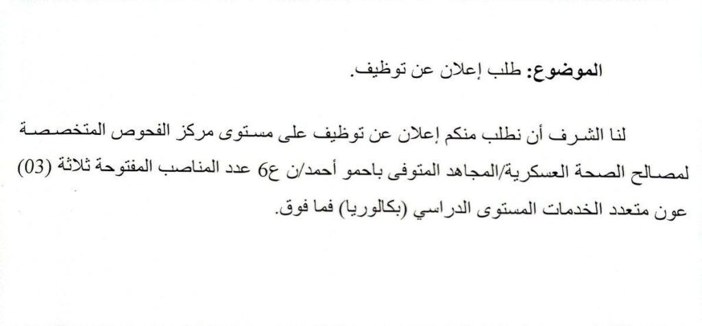 لنا الشرف أن نطلب منكم إعلان عن توظيف على مستوى مركز الفحوص المتخصصة لمصالح الصحة العسكرية المجاهد المتوفى باحمو أحمد ن ع 6 عدد المناصب المفتوحة ثلاثة (03)
