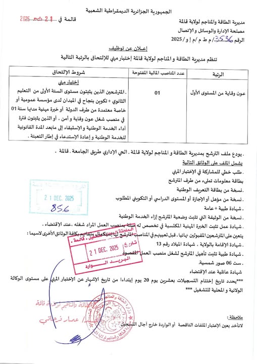 اعلان توظيف مديرية الطاقة والمناجم لولاية قالمة