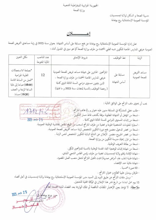 تعلن إدارة المؤسسة العمومية الاستشفائية برج بونعامة عن فتح مسابقة على أساس الشهادة بعنوان سنة 2025 للتوظيف في رتبة مساعدي المريض للصحة العمومية، لفائدة خريجي المدارس الخاصة للتكوين شبه الطبي المعتمدة من طرف وزارة الصحة، وذلك حسب ما هو موضح أدناه: