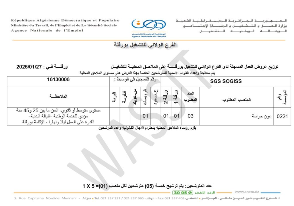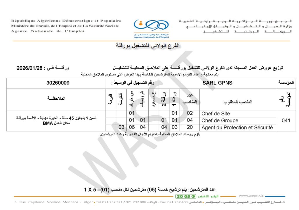 تعلن شركات الخاصة للحراسة والامن في ورقلة عن فتح مناصب عمل في التخصصات التالية