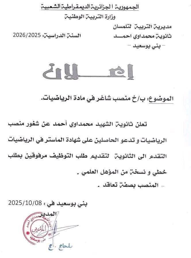 تعلن ثانوية الشهيد محمداوي أحمد ببني بوسعيد عن شغور منصب أستاذ في مادة الرياضيات للسنة الدراسية 2025 / 2026.
