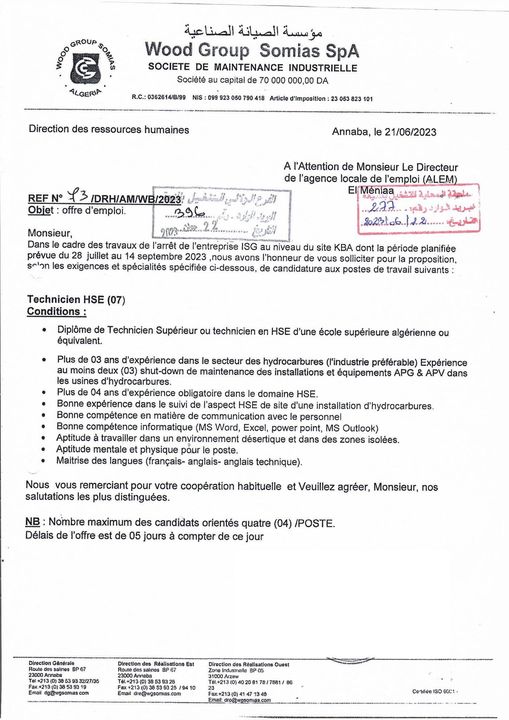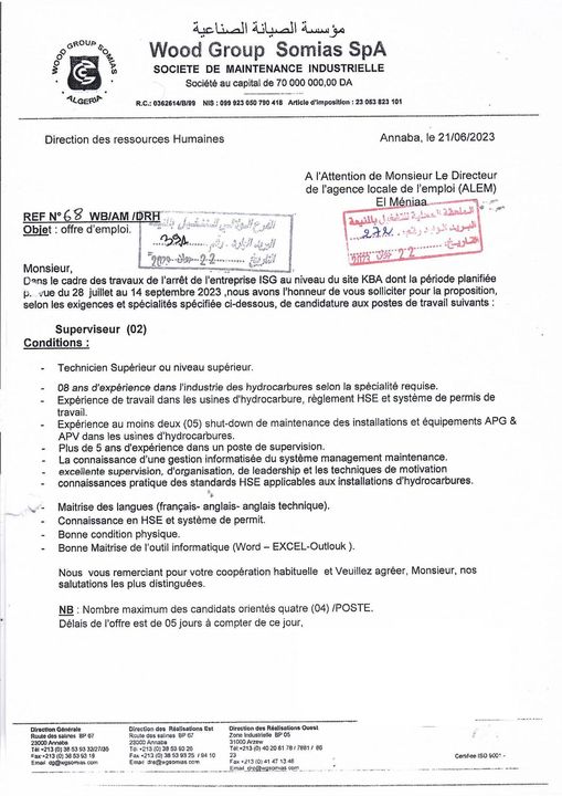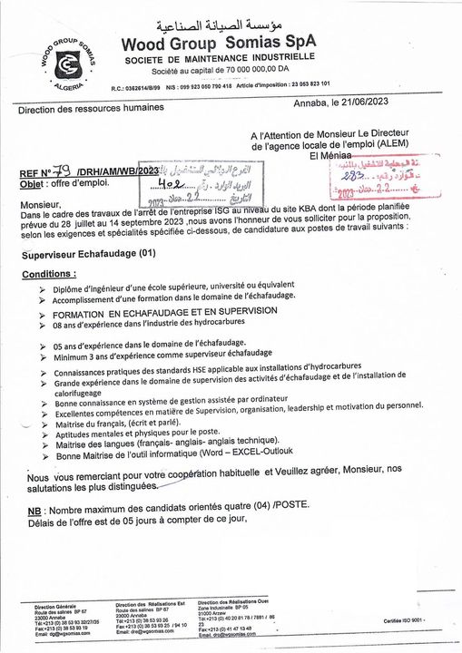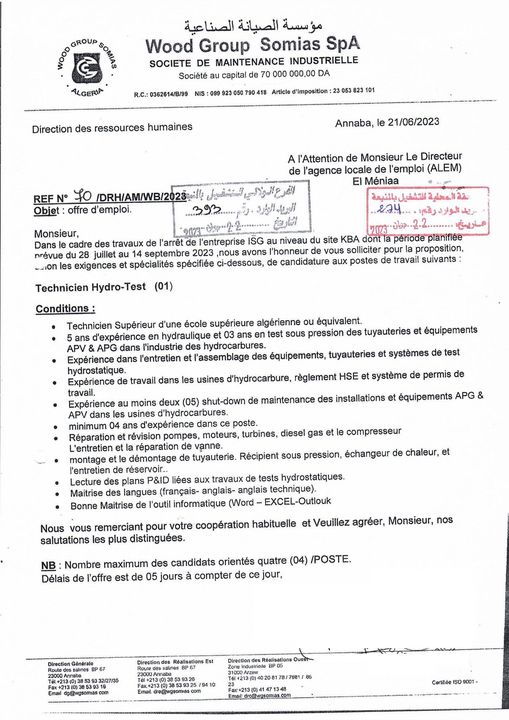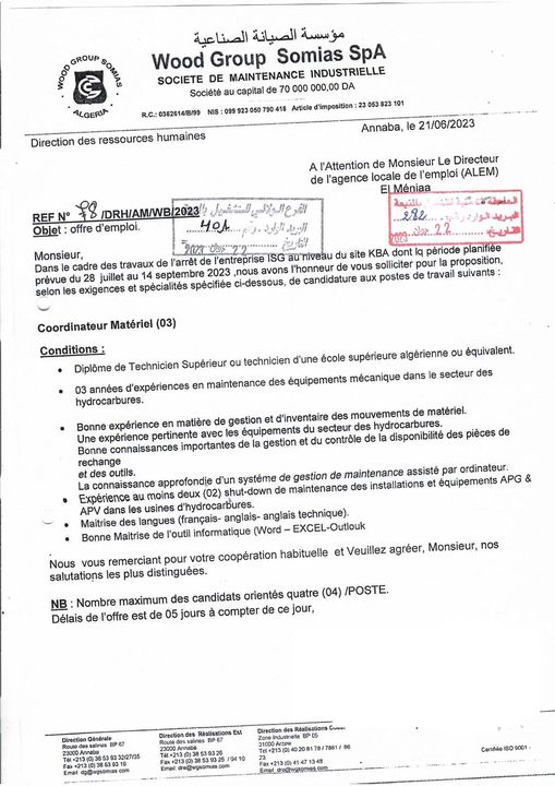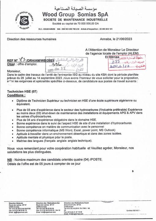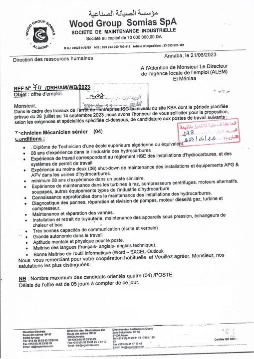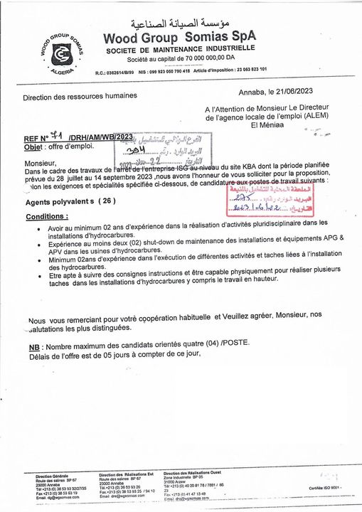 اعلان عرض عمل بمؤسسة الصيانة الصناعية somias المنيعة 96 منصب