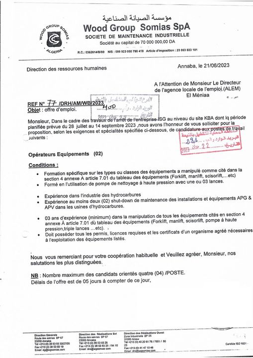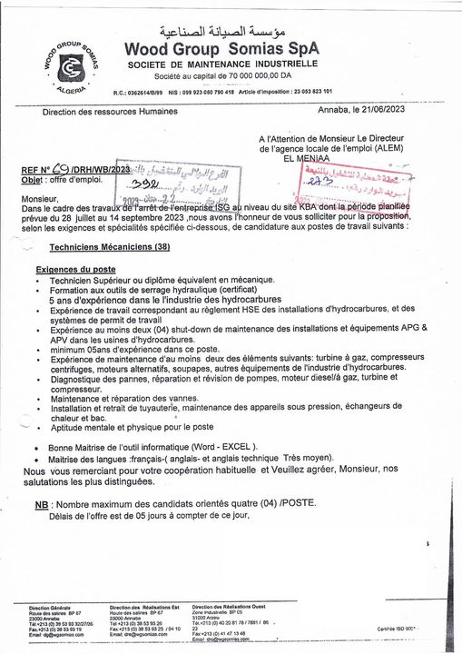 تعلن المؤسسة الصيانة الصناعية somias بولاية المنيعة عن فتح مناصب في عدة تخصصات