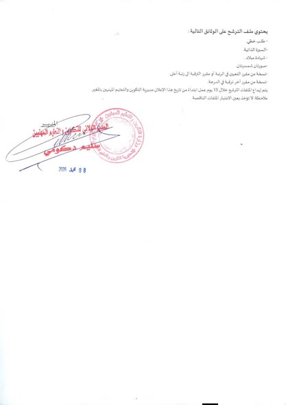 | رئيس مكتب التوجيه والامتحانات والمسابقات وتسيير الشهادات | مديرية التكوين والتعليم المهنيين لولاية المغير | – المستشارين الرئيسيين في التوجيه والتقييم والإدماج المهنيين؛ على الأقل أو رتبة معادلة؛ المرسمين – الأساتذة المتخصصين في التكوين والتعليم المهنيين من الرتبة الثانية والأساتذة المتخصصين في التكوين والتعليم المهنيين من الرتبة الأولى؛ ومستشاري التوجيه والتقييم والإدماج المهنيين؛ والمساعدين التقنيين والبيداغوجيين؛ أو رتبة معادلة؛ الذين يثبتون ثلاث (3) سنوات من الخدمة الفعلية بهذه الصفة. |