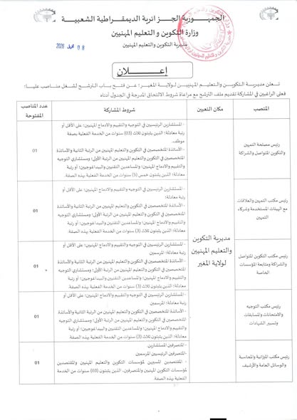 اعلان عن فتح باب الترشح لشغل مناصب عليا في مديرية التكوين والتعليم المهنيين