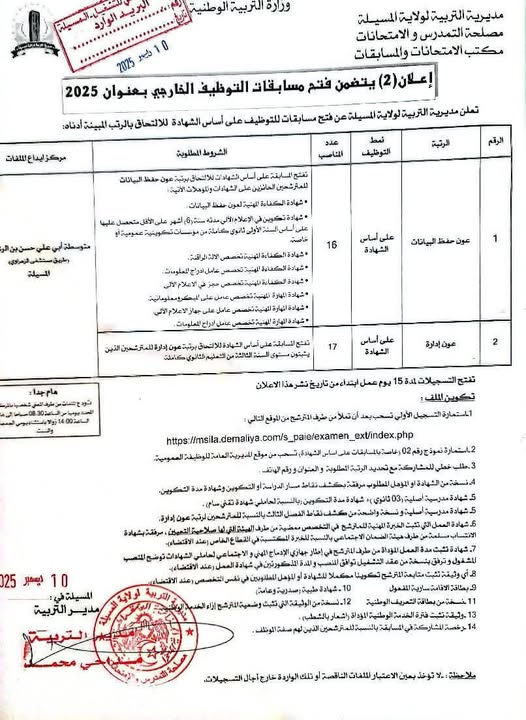 تعلن مديرية التربية لولاية المسيلة عن فتح مسابقات للتوظيف على أساس الشهادة بعنوان سنة 2025 للالتحاق بالرتب المبينة أدناه: