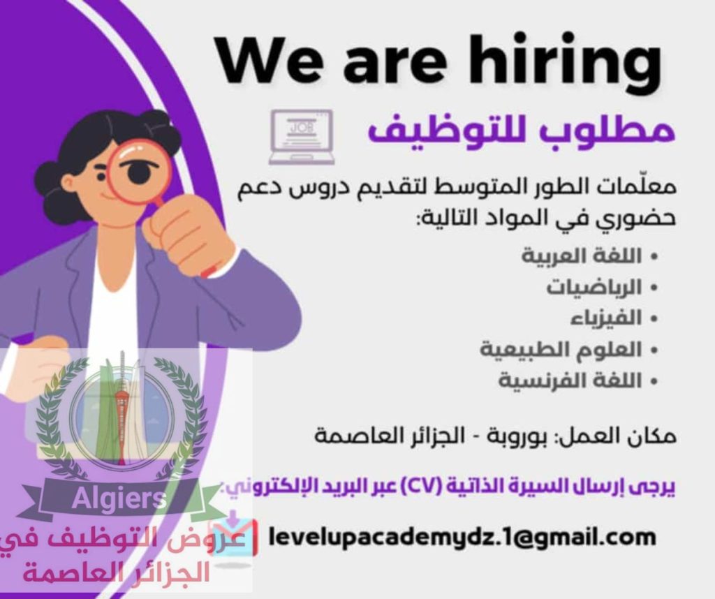 تعلن أكاديمية عن فتح باب التوظيف لمعلمات الطور المتوسط لتقديم دروس دعم حضوري في المواد التالية: