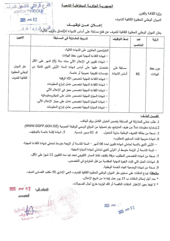 اعلان فتح توظيف بالديوان الوطني للحظيرة الثقافية لتندوف