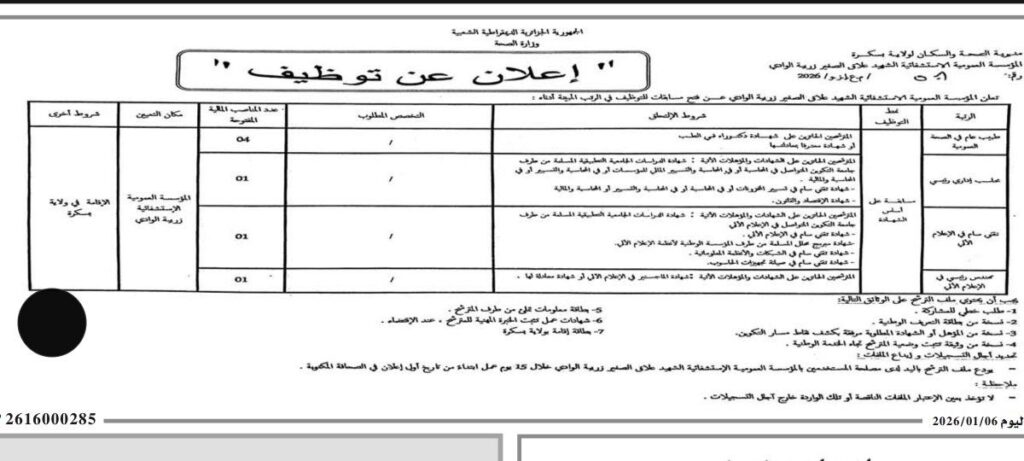 تعلن المؤسسة العمومية الاستشفائية الشهيد علاق الصغير بزريبة الوادي عن فتح مسابقات للتوظيف في الرتب المبينة أدناه: